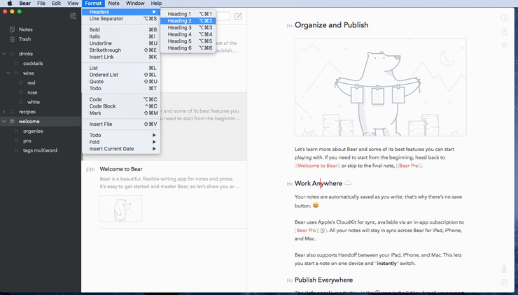 Upon installing and launching Bear for the first time, its lack of features becomes apparent immediately. It’s sparse. A series of introductory notes show up in your app to explain how Bear works. There are no folders or notebooks for organizing notes, only tags. There is no rich formatting panel, only support for Markup and a handful of menu options for applying styles when you don’t know the keyboard shortcuts.