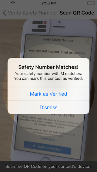 If you see a mismatch, something is definitely wrong and you shouldn’t talk over this channel. But chances are, your safety numbers will match. If everything looks good, mark your partner as “Verified.”