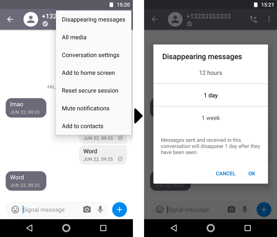 While Signal lets you delete individual messages, these messages will only be deleted on your device, and are still accessible by anyone else in your conversation. Instead, using Signal’s “disappearing messages” feature allows us to remove messages from a conversation automatically, after whatever amount of time we choose. This is particularly important for journalistsconcerned about messages on a source’s phone.