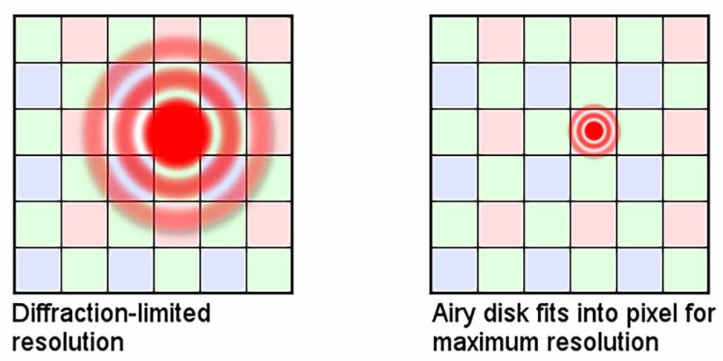 “Ideally, you want the size of an Airy disk to be small enough that it doesn’t overlap from one pixel to many others. On most recent flagships, pixel sizes aren’t much smaller than the diameter of the Airy disks present in those systems. But because they use such small sensor sizes, they’ve had to limit resolution in order to avoid Airy disk overlap…”