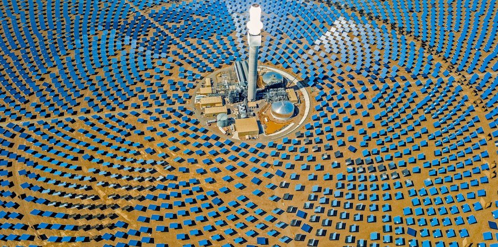 In July 2016, a solar-powered airplane flying over the desert region of Andalusia in Spain photographed breathtaking images of the Gemasolar concentrated solar power plant. The plant, operated by Torresol Energy, consists of 2,650 heliostats — mirrors that turn to track the motion of the sun, fanning out around, and reflecting sunlight toward, a 150-meter (490-foot)-high tower. The central tower houses molten salts that can store the energy of that light for extended periods of time.