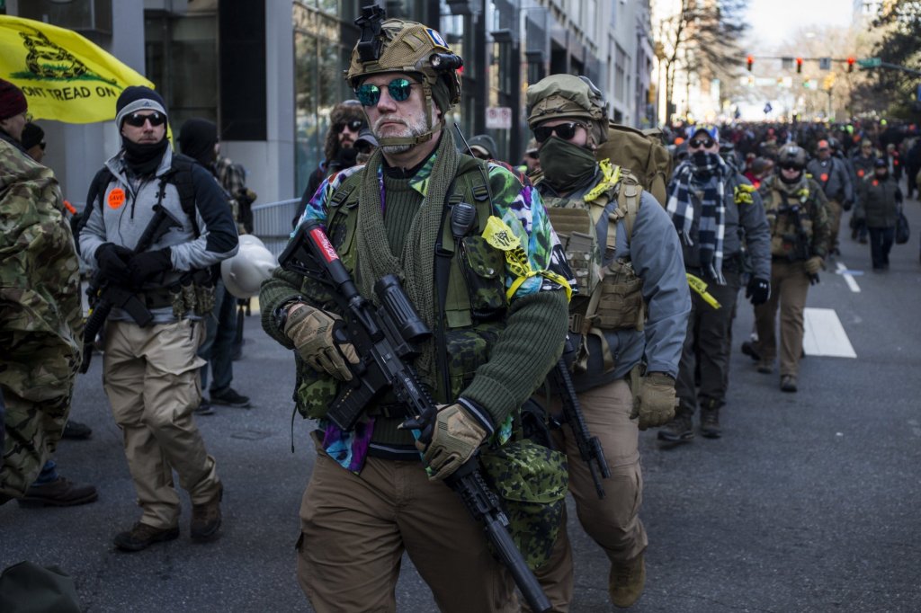 Masked, armed men waving machine guns and chanting neo-fascist slogans massed on the steps of a state capitol — on the anniversary of a society’s major civil rights leader…who was gunned down to death.