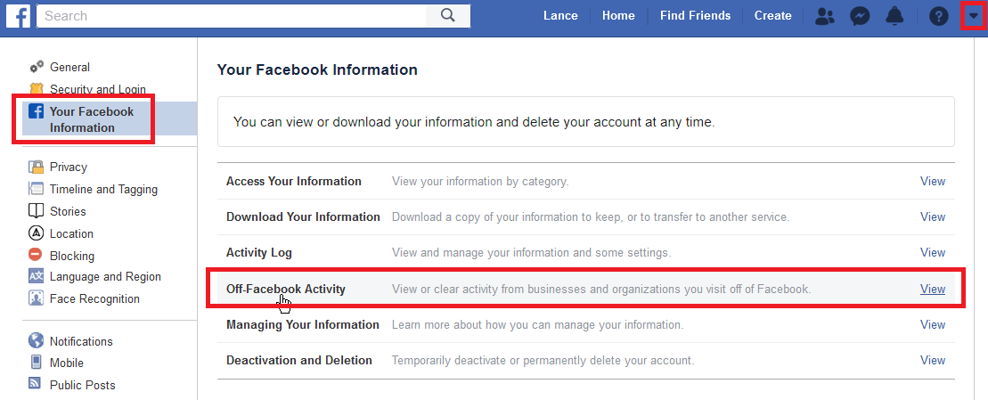 If you’re uncomfortable with this type of tracking, especially since it occurs when you’re not using Facebook, you can use the Off-Facebook Activity tool to manage this information. Access this feature by clicking the down arrow in the top right and selecting Settings. At the Settings screen, select the setting for Your Facebook Information and then click the option for Off-Facebook Activity.