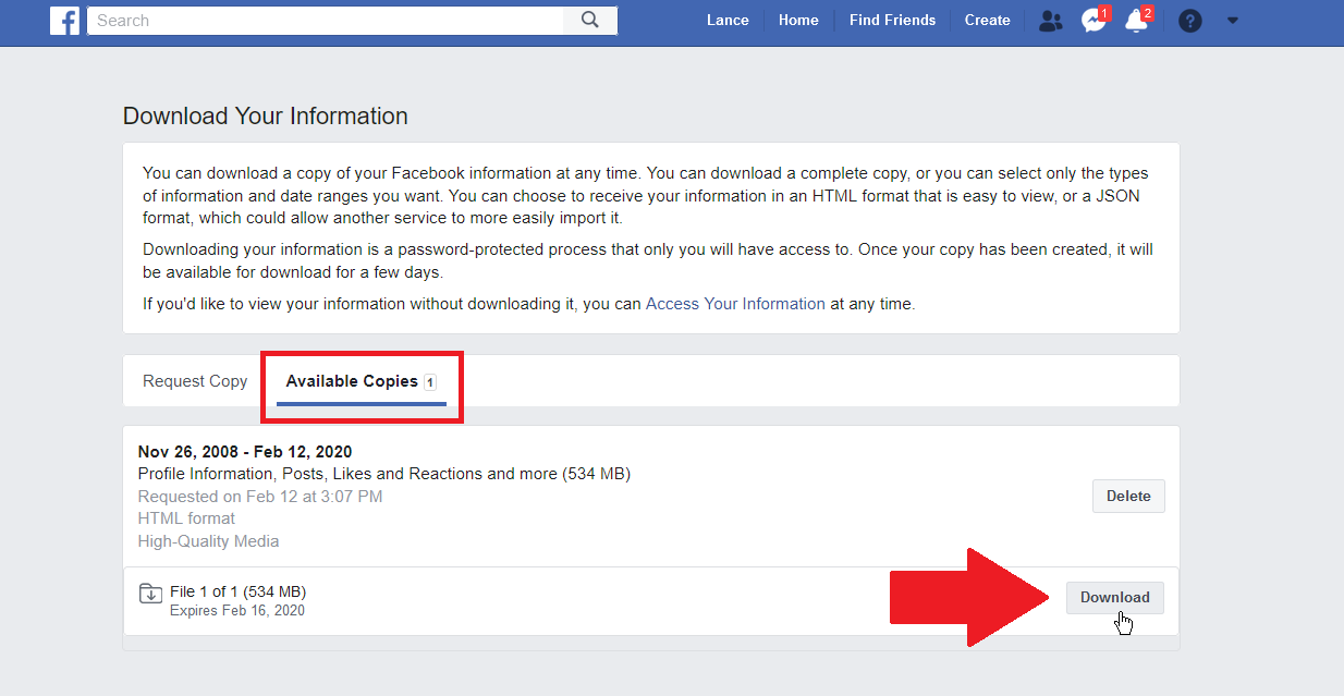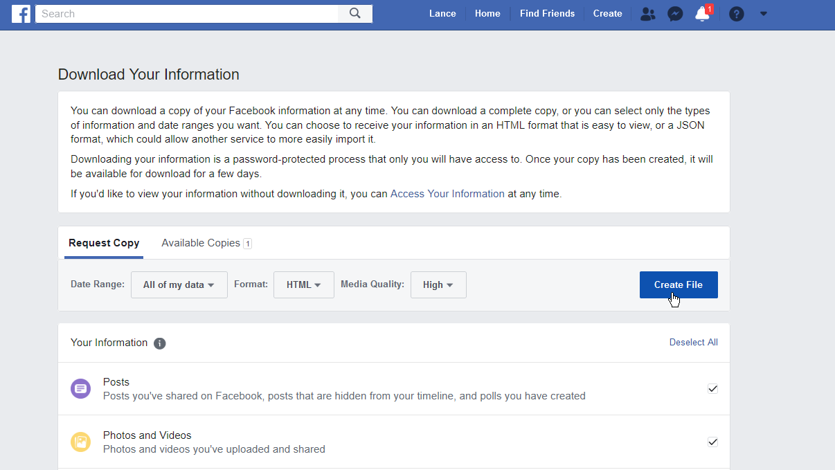 The page tells you that a copy of your information is being created. You also receive a notification by email. After the file is compiled and ready for download, you’ll receive another notification email. At the Download Your Information page, click the Available Copies tab, then click the Download button to save the information as a zip file. Unzip the file and open it to review the information. From the extracted files, open the index.html file. From there you can access and view whatever categories of information you downloaded.