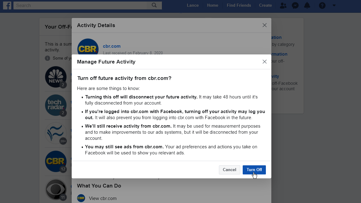 At the next page, you can view the activity you’ve already turned off. You can also turn off all future activity by toggling the switch next to “Future Off-Facebook Activity” to off.
