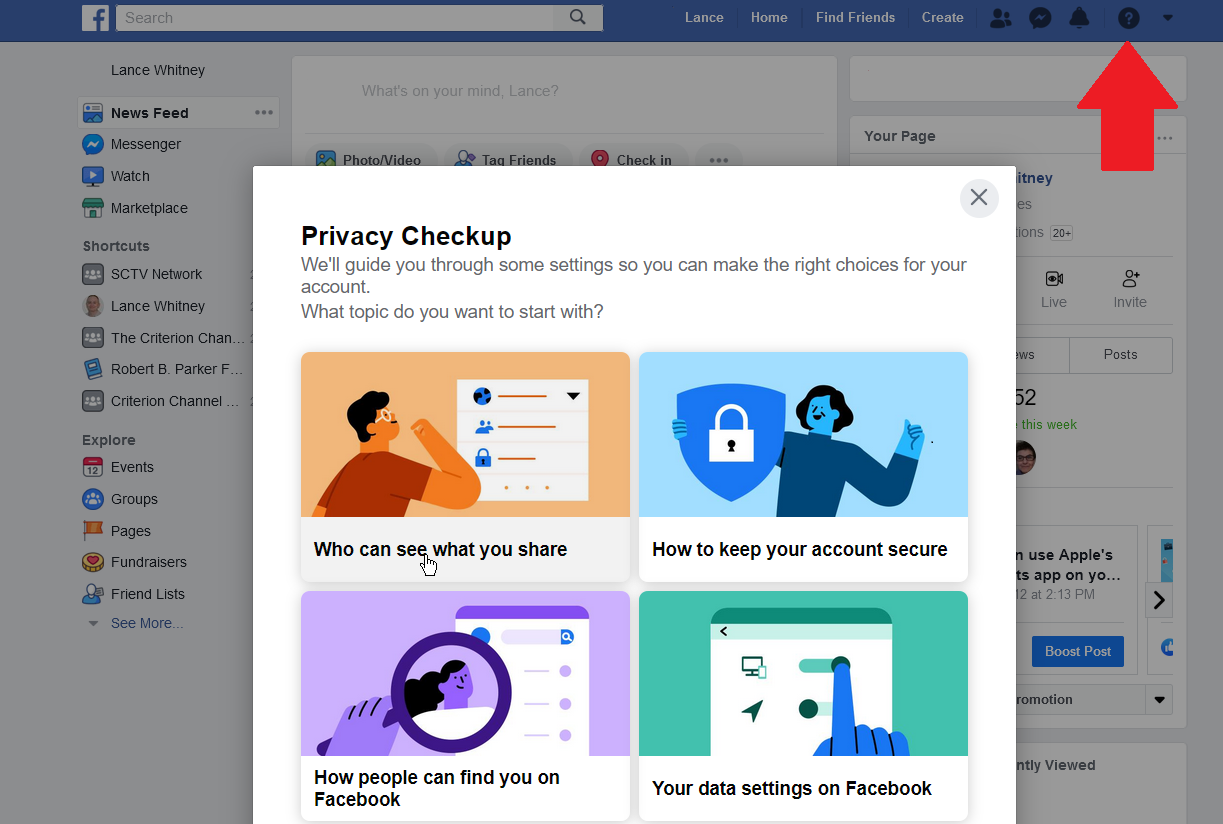 To run the latest version of Facebook’s Privacy Checkup tool, click the question mark icon in the upper right and select Privacy Checkup. At the Privacy Checkup window, click the first topic for “Who can see what you share.”