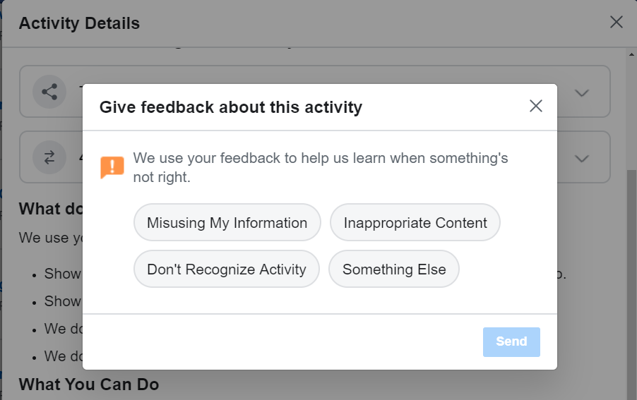 If you wish to flag a site as inappropriate content or a misuse of your information, scroll to the bottom of the Activity Details screen and click the “Give feedback about this activity” link. Select a reason for the feedback and click Send.