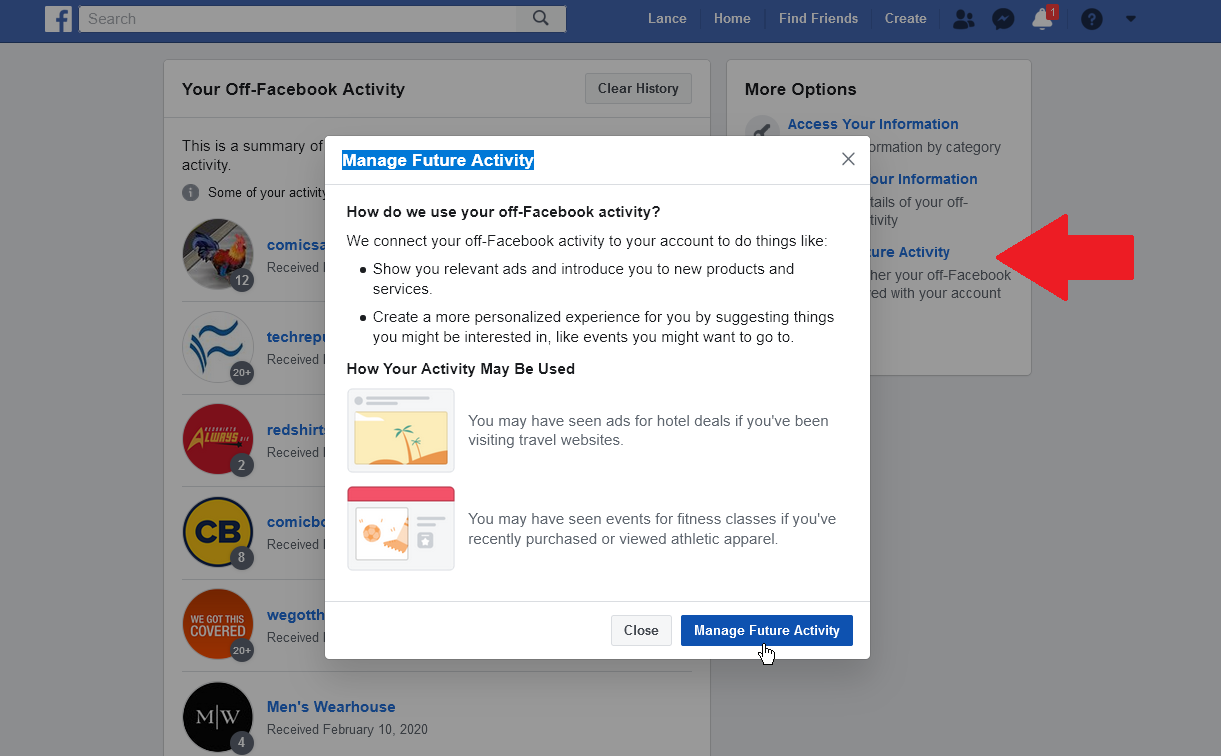 You can manage both past and future activity from the Off-Facebook Activity screen by clicking Manage Future Activity. Read the information on how off-Facebook activity is used, then click Manage Future Activity to take control.