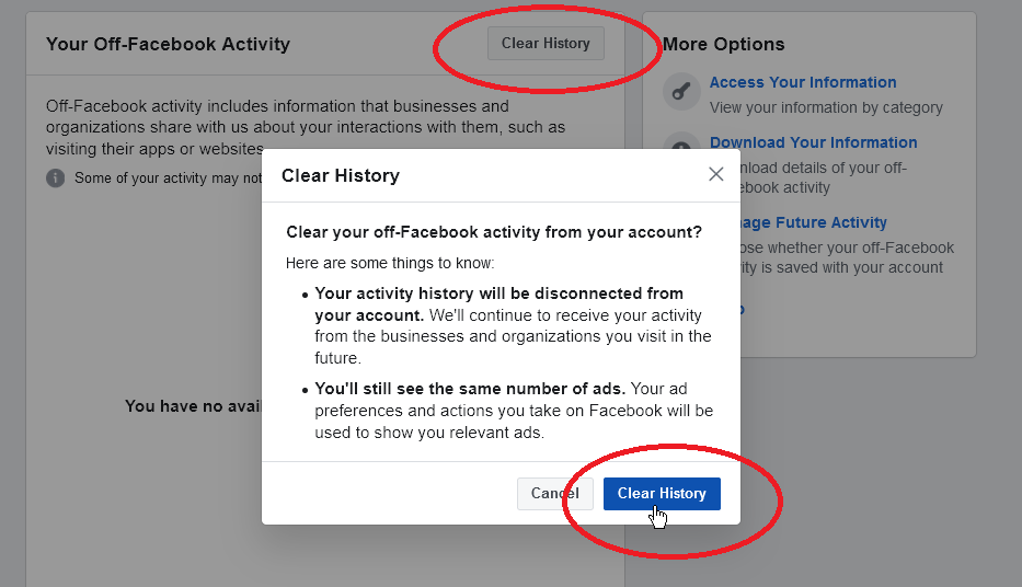 You can also remove your entire off-Facebook activity history. Click the Clear History button at the top, then hit Clear History.