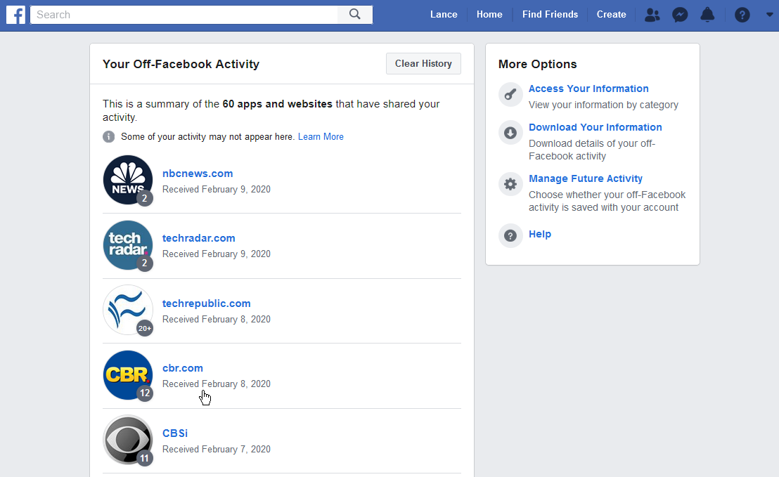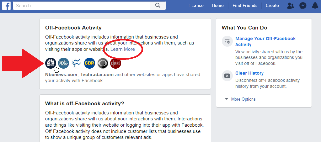Facebook displays the names of some sites that have shared your activity with the company and informs you how the company gains access to this kind of information. Get more details about your overall off-Facebook activity by clicking the “Learn More” link up top. Or click the icon for any site at the top to view your off-Facebook activity, then enter your password.