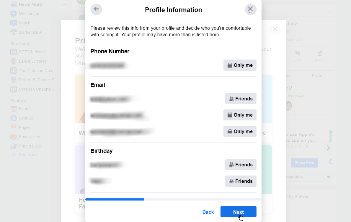 Click Continue. At the Profile Information window, review the settings for your phone number, email addresses, and birthday. Click the button next to each setting and choose whether to change it to Public, Friends, Only Me, or a specific Facebook list. In general, you’ll want to set each of these to Friends, Only Me, or a specific list. When done, click Next.