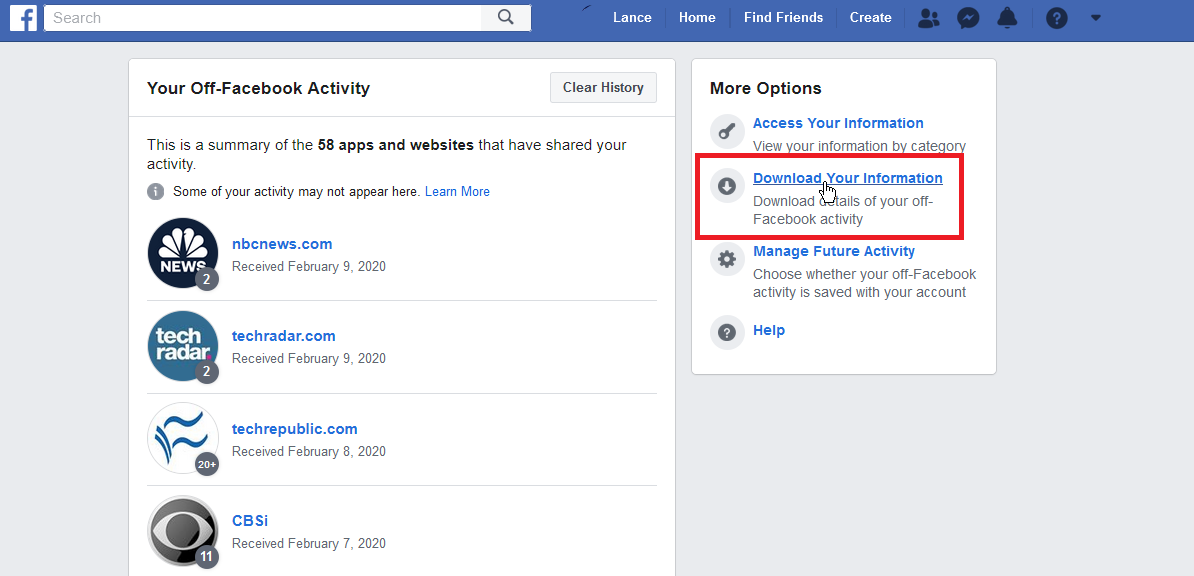 To download your Off-Facebook activity, return to the Off-Facebook Activity page, and click “Download Your Information” on the right.
