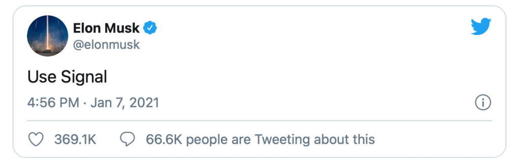 A few days earlier, on January 4, Facebook-owned WhatsApp had issued a new privacy policy, which many interpreted would mean users would be required to share personal information with Facebook’s ad network in order to use the platform. Facebook has clarified that WhatsApp messages will remain encrypted and personal information like contacts would not be shared with Facebook. Still, many users — goaded in part by Musk’s tweet — flocked to other encrypted messaging apps like Telegram (now No. 2 in the App Store) and Signal (now No. 1).
