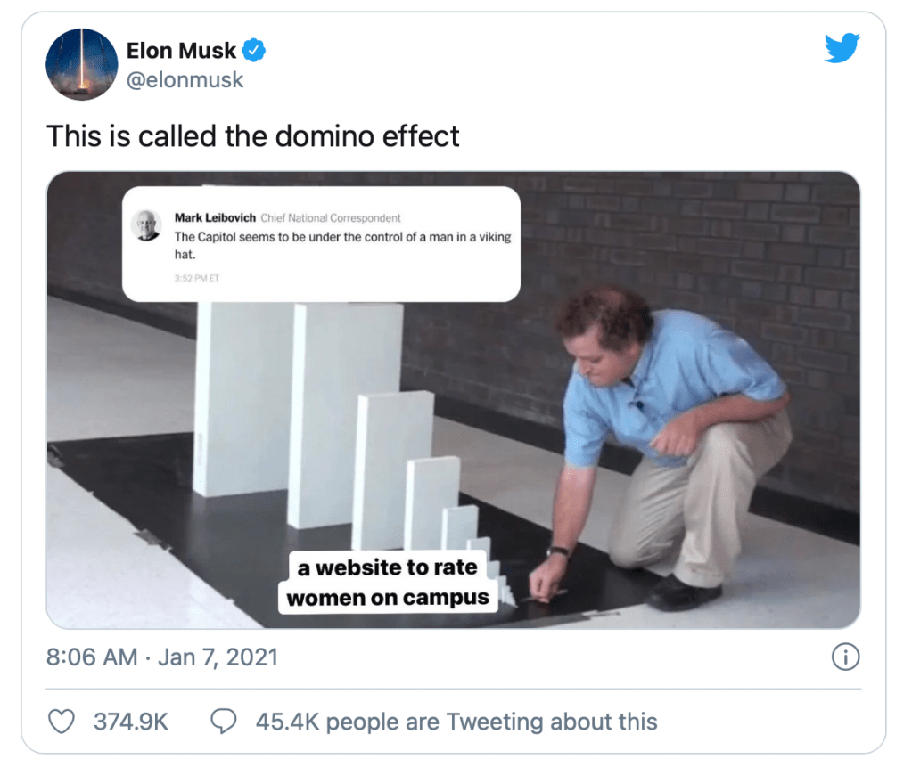 Musk’s tweet came a day after he had tweeted a meme blaming Facebook for its role in the violent storming of the Capitol, in which Trump supporters, amped up on conspiracy theories about a stolen election, failed to stop Congress from certifying Joe Biden’s election victory. The meme illustrates the “domino effect” from Facebook’s beginnings as “a website to rate women on campus” to the Capitol being “under the control of a man in a viking hat.”