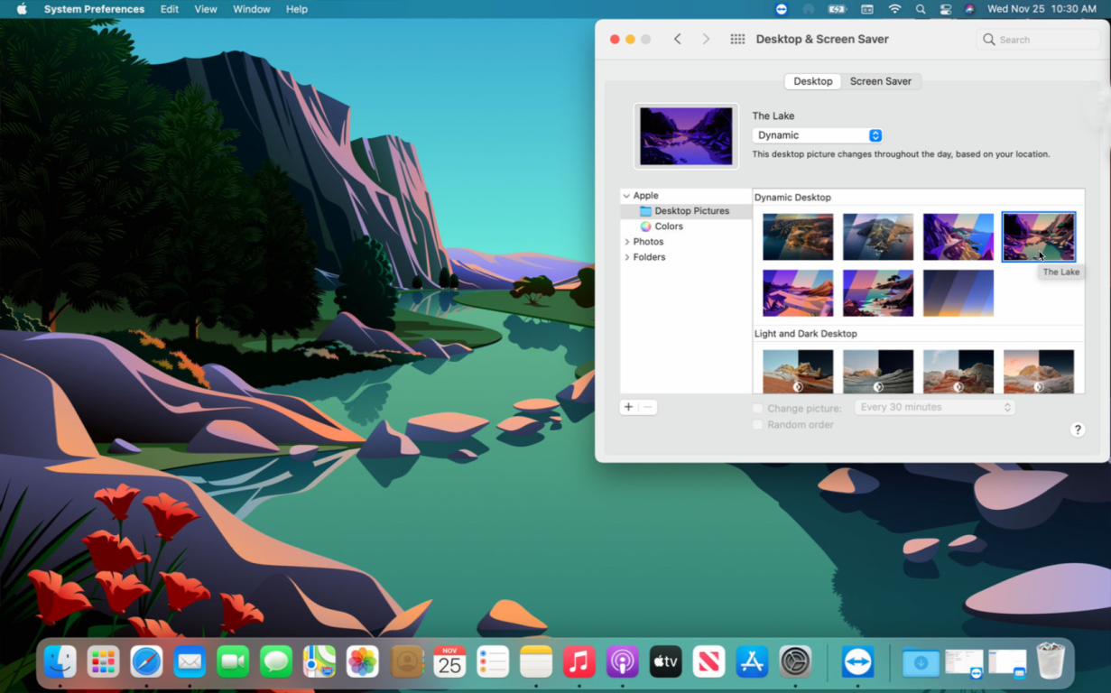 Under System Preferences > General, Big Sur adds several new images that you can set up as your wallpaper. As in previous versions of macOS, you can choose a dynamic wallpaper that changes between light and dark as the day and night progress. There are a greater variety of pictures, though, including cool variations on the usual scenic themes.
