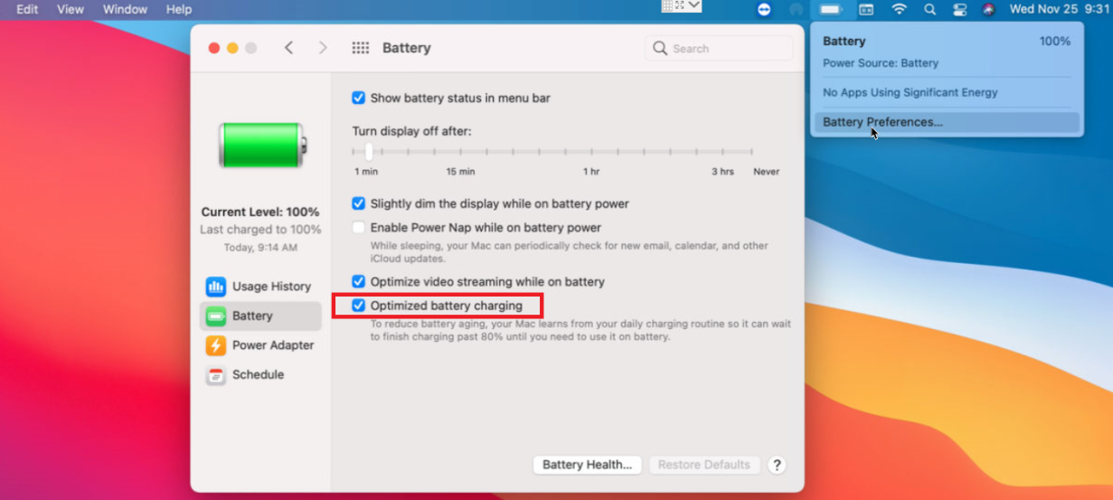 Big Sur now offers more details and a dedicated system preference just for your battery. Click the battery icon on the Menu bar to see the percentage of charge left. Then select the option for Battery Preferences to determine when the display shuts off battery power, enable Power Nap in battery mode, and optimize video streaming on battery power.