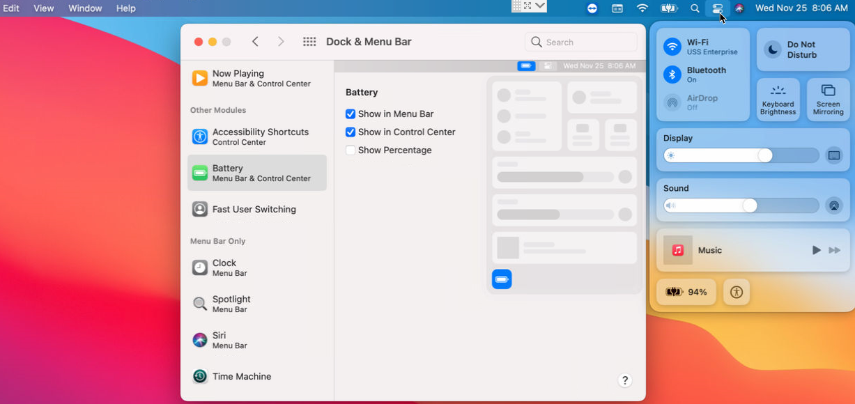 Pin controls from Control Center to the Menu Bar for even quicker access; you can do this one of two ways. Click the icon for Control Center, then drag and drop a specific icon to the Menu Bar. Alternatively, go to System Preferences > Dock & Menu Bar. In the left pane in the Control Center section, select a specific control and then check the box to “Show in Menu Bar.”