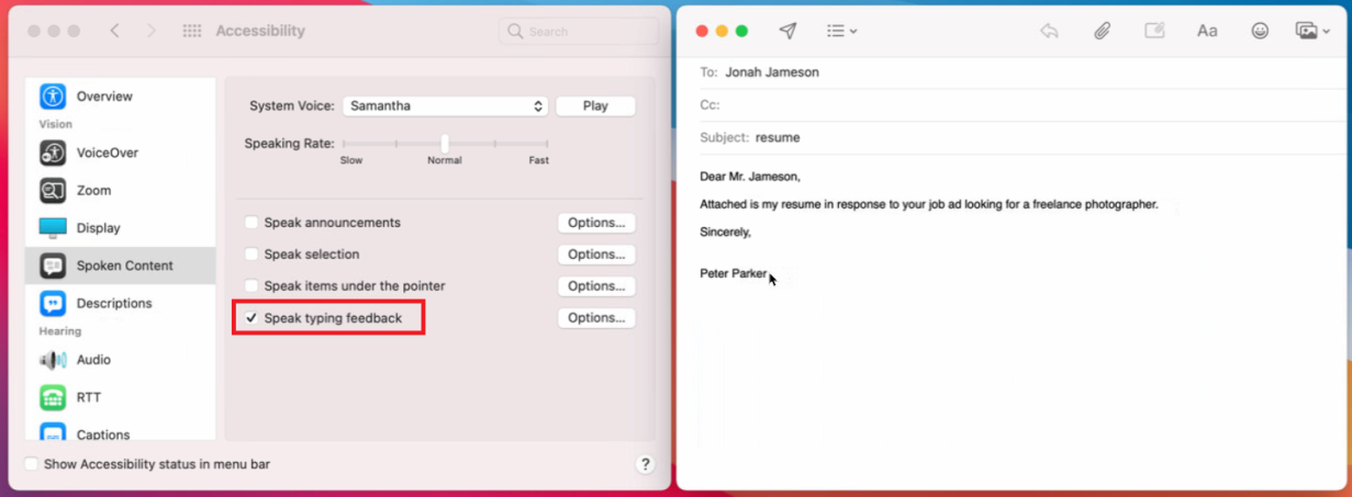 If you have trouble seeing the screen, you can now hear letters and words spoken aloud as you type them. To set this up, go to System Preferences > Accessibility. In the Spoken Content section, check the box for “Speak typing feedback.” Now open any app in macOS into which you can type. As you type a letter, the feature reads it aloud. After you’ve typed a word, that word is read aloud. Enter a space, new paragraph, punctuation marks, or other entries, and those are read aloud as well.