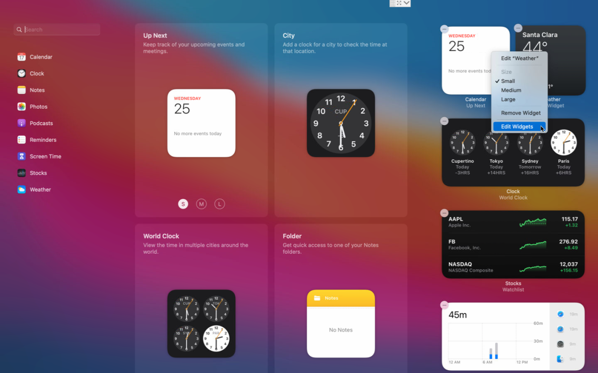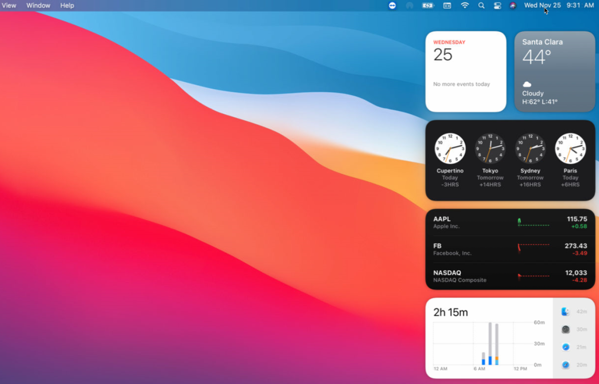 Borrowing another feature from iOS/iPadOS, Big Sur now displays notifications and widgets in the same section. Click the date and time in the Menu bar to view any notifications and see the default widgets, such as date, weather, World Clock, and Screen Time. Click a widget to open the corresponding app.