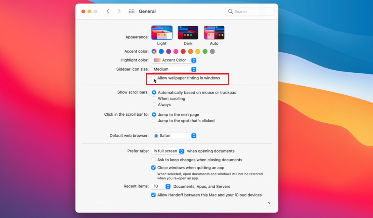 Further, the default setting for wallpaper tinting can be annoying as it changes the shading of windows, apps, and other items in macOS. To switch the display of windows to a more neutral color, go to System Preferences > General and uncheck the box for “Allow wallpaper tinting in windows.”