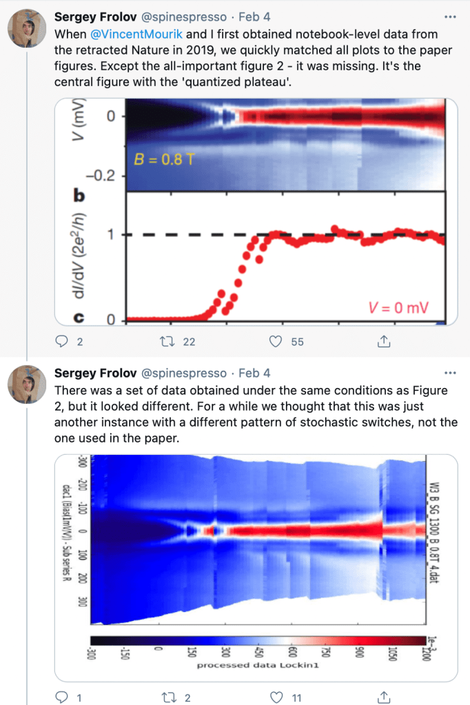 Frolov says he saw multiple problems in the unpublished data, including data points that strayed from the line but were omitted from the published paper. If included, those data points suggested Majorana particles could not be present. Observations flagged by Frolov are visible in the charts in the new paper released last month, but the text does not explain why they were previously excluded. It acknowledges that trying to experimentally validate specific theoretical predictions “has the potential to lead to confirmation bias and effectively yield false-positive evidence.”