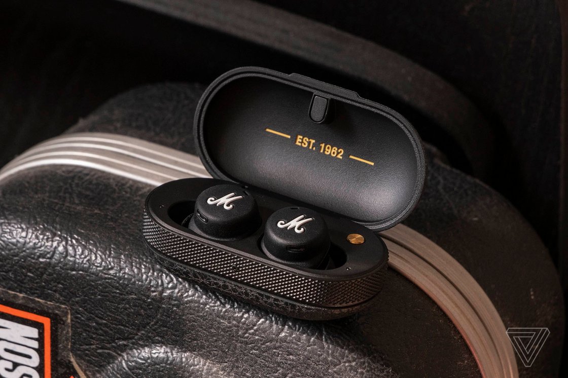 The earbuds have a matte black finish with a very prominent “M” on them; you’re definitely wearing the Marshall brand with these. They’re nicely compact and not as chunky as some competitors like the Jabra Elite 75t. Marshall includes four sizes of silicone ear tips in the box — including an XL option, which is nice to see. Some foam tips would’ve been even nicer.