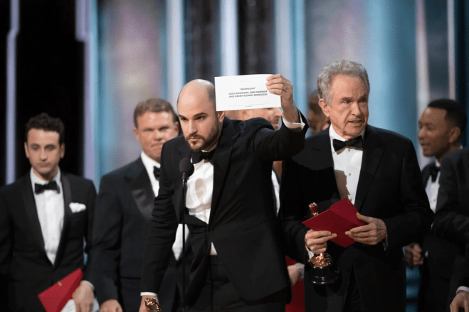 Last night’s Oscars bizarreness was not just bizarre but bizarre in a way that is typical of this entirely bizarre time. The rhythm of the yes-they-won-oh-my-God-no-they-didn’t event, with “La La Land” replaced by “Moonlight” as Best Picture, was weirdly like that of . . . Election Night. First, a more or less expected, if “safe,” result was on its way—although Hillary Clinton never got all the way to the stage, so to speak, the result did seem safely in hand at 7 P.M., according to the polling—and the expected and safe people were ready to deliver their touching but obviously polished pieces. Then the sudden confusion and visible near-panic of people running around in the background of the stage, with the same slightly horrified spirit that one felt on Election Night as shocking results began emerging from the exurban counties in Florida. Then, yes—can this be happening?—the revised and unexpected result.