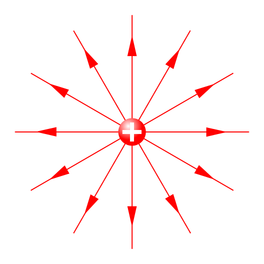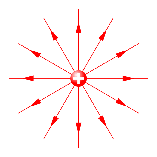 This electric field points radially outward (for positive charges) or inward (or for negative charges) from the position of the charge.