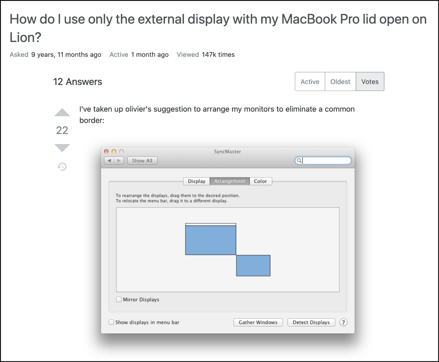 If you want to do this you’re out of luck. You can’t disable the screen while keeping the Macbook open. This is easy on Windows and Ubuntu but impossible on macOS. The top suggestion was a laughable workaround: Arrange the displays such that they didn’t overlap and reduce the Macbook brightness to zero.