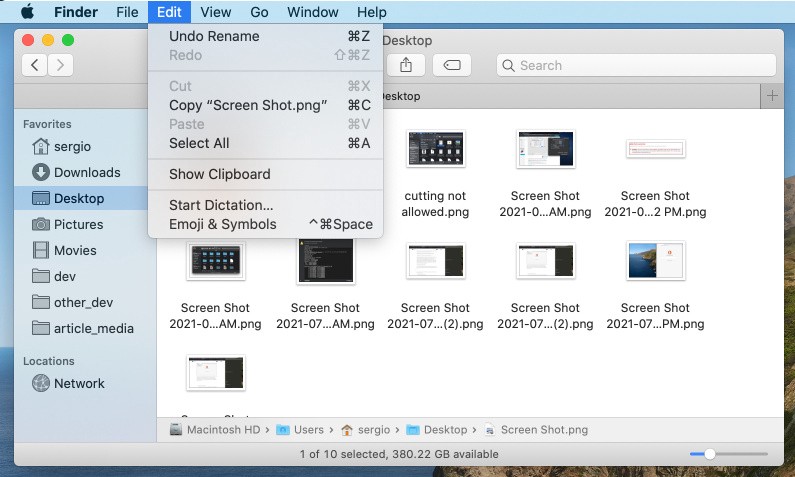 On most computers, files can be cut, copied, and pasted just like text. In Finder, the cut is disabled.