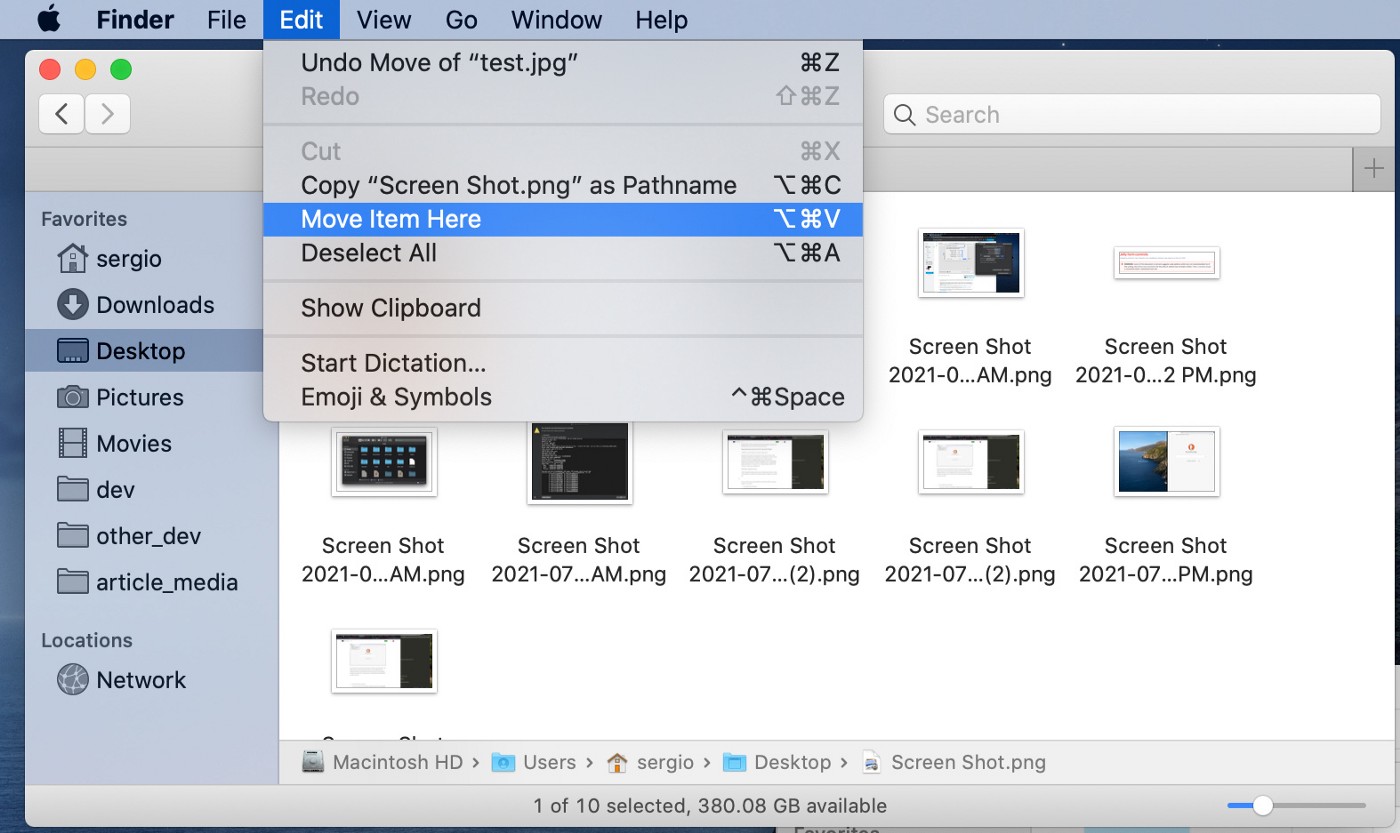 Technically there is a way to cut-and-paste, but it’s not what you‘d expect. It’s not cut and paste. macOS has copy and disregard-copy-actually-move-instead. Holding down the option key reveals this extra menu item.