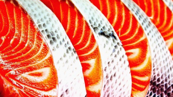 This elaborate set-up is crucial to mimicking the salmon’s natural lifecycle. The farm buys salmon eggs, which are kept in cool, dark conditions until they hatch and the baby fish are transferred to a freshwater tank until they reach 100 grams. At that point, farm technicians simulate winter by turning down the lights for most of the day and the fish are moved from the freshwater tanks into salt-water units, eventually passing through ten different systems in their lifetimes. After 20 months the fully grown fish are piped from their final tank into the farm’s processing facility to be stunned, gutted, graded for quality and packaged, ready to be loaded onto trucks. Throughout the entire process, from hatching to their unceremonious entrance into the processing area, the fish never get a single glimpse of the outside world.