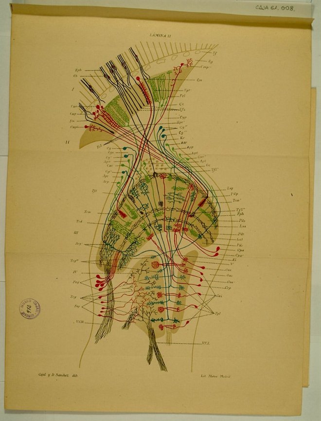 Histological slides are like manuscripts written by hand; something exists therein about the person who made them. It is the beauty of humanity, our fallibility, our imperfection, our devotion to the impossible, if not the absurd. New techniques open up new possibilities for scientific discovery, but what have we lost? Something sensual, perhaps. The end of a kind of craftsmanship, of what is handmade, a loss of contact with the source material, which comes from our body, or the absence of smell. They are more primal than the drawings of them, one stroke further upstream, towards the source. Standing in the archive at the Cajal Institute in Madrid, the stained tissue on his slides, mounted with resin, still felt gummy to my touch.
