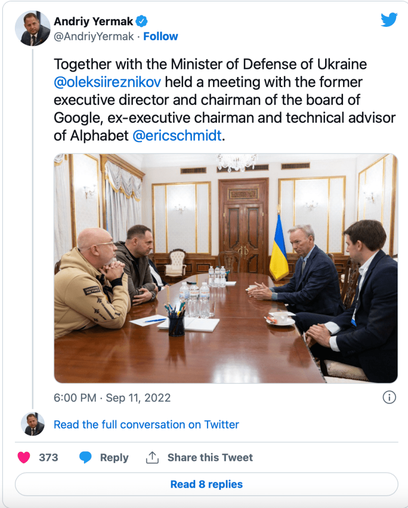 As Ukraine turned a corner 10 days ago with a military offensive that retook territory from Russia, former Google CEO billionaire Eric Schmidt was meeting with senior Ukrainian officials. He was on a 36-hour visit to the country exploring technology’s role in the war.