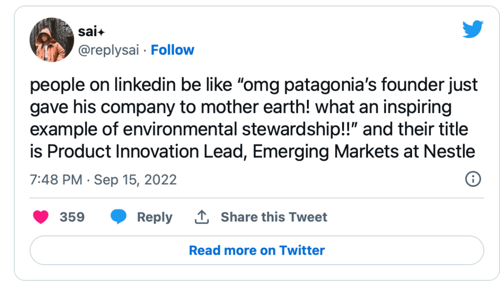 There has been, and will continue to be, plenty of admiration and praise from afar, including from within major global corporations. But just as with its sustainability influence, many will simply look at Patagonia’s move as a luxury of being a privately owned company, without the handcuffs of, and obligation to, public shareholders. Others, conveniently ignoring the precedent and arc of founder Yvon Chouinard’s 50-year career, will see it, dubiously, as creative legal maneuvering to avoid a massive tax bill.
