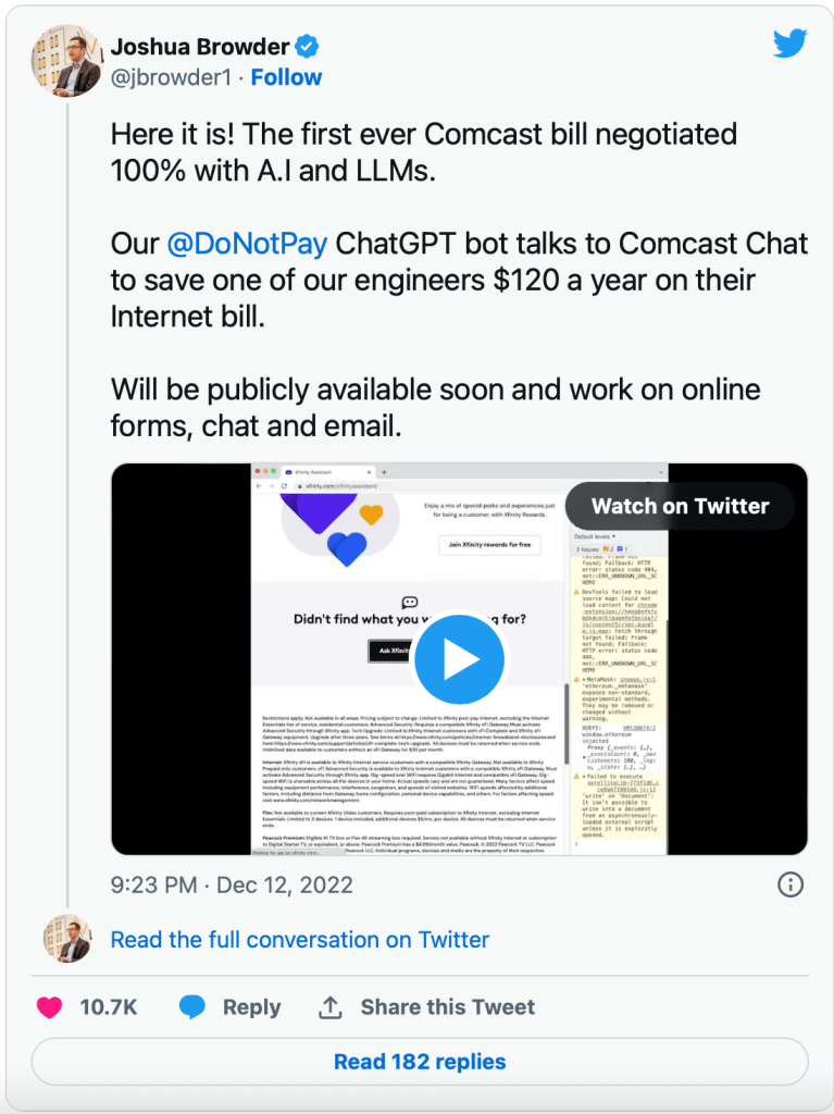 Joshua Browder, the CEO of DoNotPay, a company that automates administrative chores including disputing parking fines and requesting compensation from airlines, this week released video of a chatbot negotiating down the price of internet service on a customer’s behalf. The negotiator-bot was built on the AI technology that powers ChatGPT. It complains about poor internet service and parries the points made by a Comcast agent in an online chat, successfully negotiating a discount worth $120 annually.